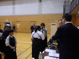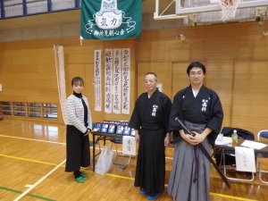 藤沢南ロータリークラブ 社会奉仕委員長 松長由美絵 様 御所見剣心会会長井出猛先生 信明館高科剣道場館長 高科建治先生 |